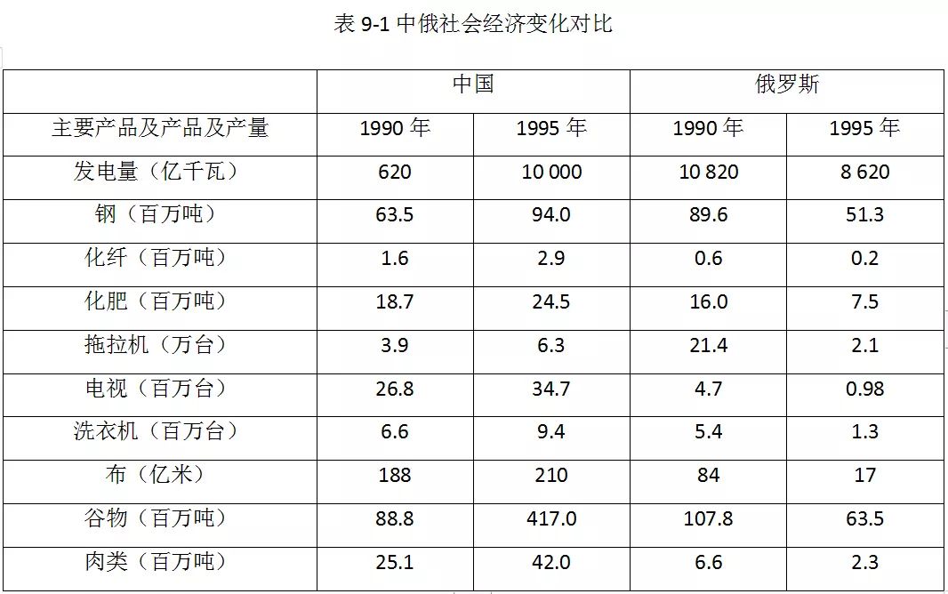 国际上,曾一度热衷于对中俄两国不同的改革道路和社会结果进行比较和评论。在此问题上,俄罗斯社会内部更是莫衷一是,中俄改革比较成为报刊文章、大学讲台,甚至议会论坛的热门话题。1996年4月18日,《真理报》发表了驻北京记者克鲁申斯基搜集的一组数字(见表9-1)。