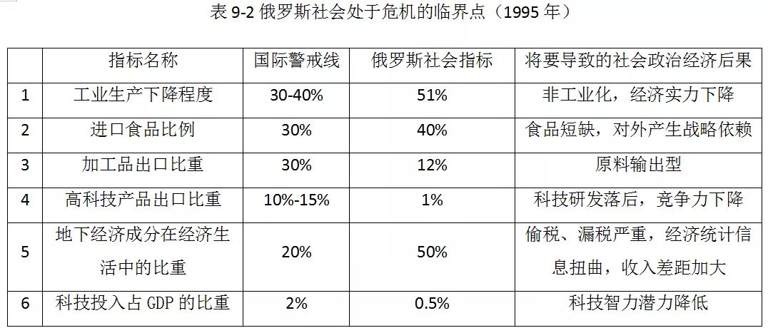 表9-2是俄罗斯科学院社会政治研究所发布的俄罗斯社会危机指标监测数据。