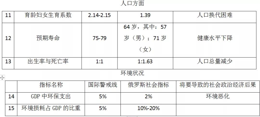 1.人口减少、寿命降低。1992年,俄罗斯社会的死亡率超过了出生率。这是自1942年“二战”以来,俄罗斯人口生产首次出现负增长,特别是人口自然减少的幅度增大。由于民族冲突不断,战争使冲突地区的居民颠沛流离,纷纷举家迁移至辽阔的俄罗斯内地,这在一定程度上弥补了人口减少的缺额,但俄罗斯社会上下对未来的人口形势表示忧虑。如今,受生活所迫,俄罗斯许多年轻家庭放弃了生孩子的打算,人口增长急剧下降。根据最乐观的估计,在经济形势好转的情况下,俄罗斯人口恢复增长,要经过15-20年的时间。否则,俄罗斯人口将锐减,年龄结构和性别比例恶化。1995年,俄罗斯男性居民的平均寿命约57岁,而女性则为71岁。