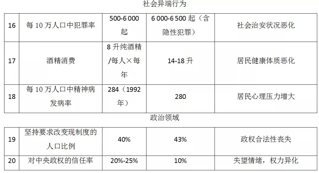 俄罗斯居民普遍认为,“休克疗法”的社会效果不佳,主要表现为百姓生活水平下降、贫富分化、治安状况恶化等几个方面。同时,持续几年的经济危机也对俄罗斯社会的人口、健康以及就业形势等产生了严重影响。