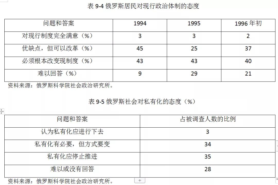 从以下表格中可以看出,20世纪90年代中后期,大多数俄罗斯人对几年来的改革并不满意。老百姓对叶利钦推行的改革的评判,主要出自于切身的生活感受。现实生活中失望多于希望,这种态度可以在俄罗斯民众看待政治制度、经济私有化等重大问题的态度上体现出来。(见表9-3、表9-4、表9-5)