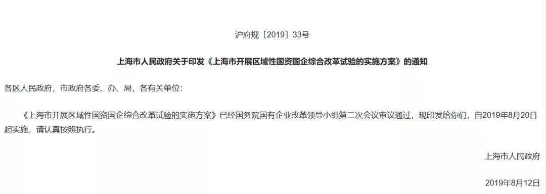 9月初,在《深圳市区域性国资国企综合改革试验实施方案》正式披露后不久,另一个中国国企改革先锋城市上海,全文公告了《上海市开展区域性国资国企综合改革试验的实施方案》(以下简称上海33号文)。