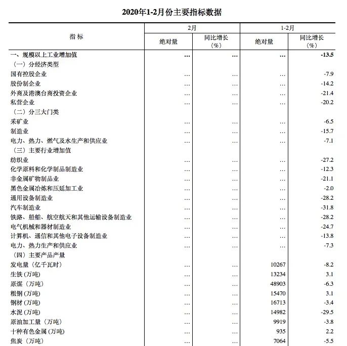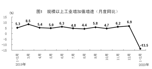 1-2月份,规模以上工业增加值同比下降13.5%。分经济类型看,国有控股企业增加值下降7.9%;股份制企业下降14.2%,外商及港澳台商投资企业下降21.4%;私营企业下降20.2%。分三大门类看,采矿业增加值下降6.5%,制造业下降15.7%,电力、热力、燃气及水生产和供应业下降7.1%。从产品产量看,医疗防护和生活所需物资增长较快,口罩、发酵酒精产量分别增长127.5%和15.6%,冻肉和方便面分别增长13.5%和11.4%。高技术产品增势良好,智能手表、智能手环、半导体分立器件和集成电路产量分别增长119.7%、45.1%、31.4%和8.5%。基本原材料生产平稳,生铁、粗钢、平板玻璃、十种有色金属产量分别增长3.1%、3.1%、2.3%和2.2%。全国采购经理调查数据结果显示,截至2月25日,大中型制造业企业复工率达到85.6%,生产经营活动正有序恢复。