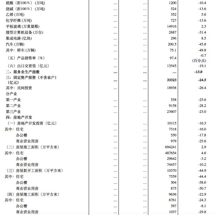 1-2月份,全国固定资产投资(不含农户)33323亿元,同比下降24.5%。分领域看,基础设施投资同比下降30.3%,制造业投资下降31.5%,房地产开发投资下降16.3%。全国商品房销售面积8475万平方米,下降39.9%;商品房销售额8203亿元,下降35.9%。分产业看,第一产业投资下降25.6%,第二产业投资下降28.2%,第三产业投资下降23.0%。民间投资18938亿元,下降26.4%。高技术产业投资下降17.9%,降幅低于全部投资6.6个百分点,其中高技术制造业和高技术服务业投资分别下降16.5%和20.8%。检验检测服务和专业技术服务投资分别增长26.1%和4.3%。社会领域投资下降20.0%,其中卫生领域投资下降11.2%,降幅低于全部投资13.3个百分点。