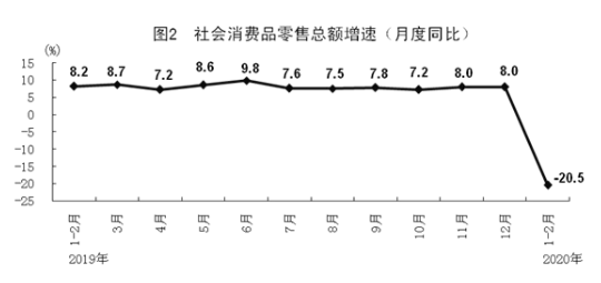 根据第四次全国经济普查结果对2019年社会消费品零售总额进行了修订,2020年1-2月份增速按照可比口径计算。