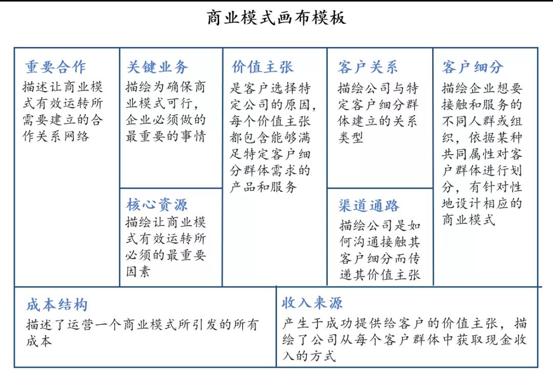 商业模式是指一个企业创造价值、传递价值以及获取价值的核心逻辑和运行机制,由客户细分、客户关系、渠道通路、价值主张、关键业务、核心资源、重要合作、收入来源、成本结构九个基本要素组成。