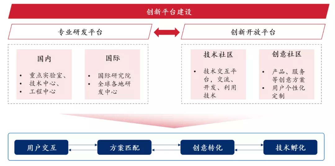 在创新资源整合方面,企业通过构建多个线上平台,开放技术社区、创意社区等,吸引外部企业围绕社区交流和讨论技术、产品、服务等创新方案,利用互联网实现全球创新资源联动,贯通用户交互、方案匹配、创意转化和技术孵化整个创新链条,既缩短了创新过程,也有效激发了各创新主体的积极性,为企业创新提供强大动力。