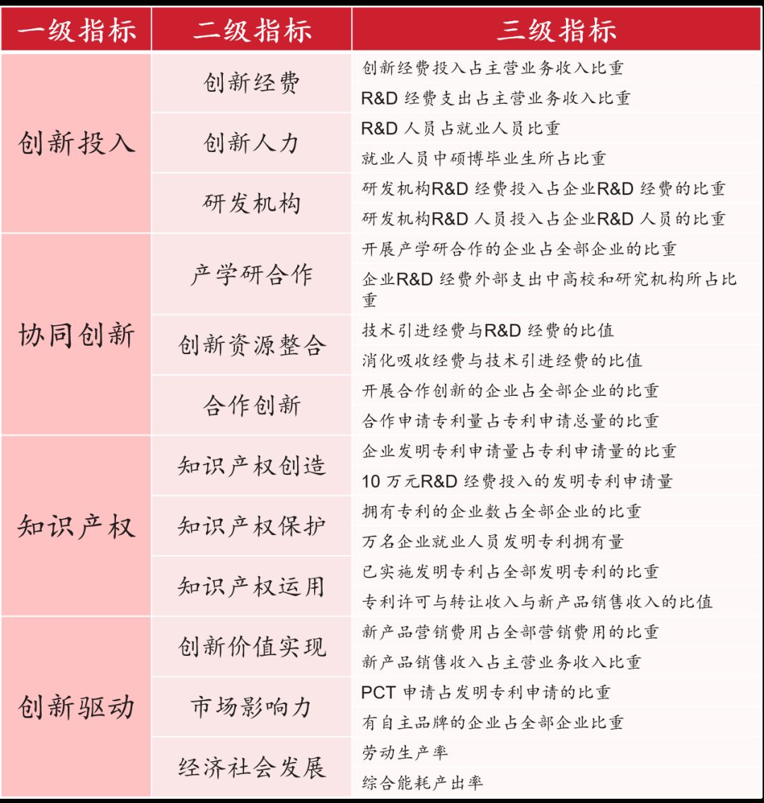 对创新能力的合理评价有利于企业反思自己的创新行为和创新模式,从而进行调整和完善,取得更大的创新效益。企业创新能力的评价重点关注创新投入、协同创新、知识产权、创新驱动四个方面的指标。