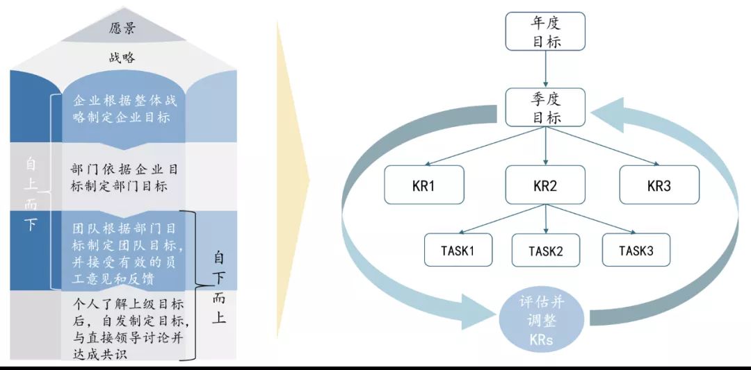 标准OKR采用“自上而下”与“自下而上”相结合的目标设定方式以达成公司至个人目标的一致性, 其中“自上而下”的方式保障了企业目标制定的规范性、程序性、系统性,而“自下而上”的方式给予了员工更多自主权,引导员工对企业目标进行深入思考,激发了他们的创造力与创新力,是创新文化落地的重要抓手。