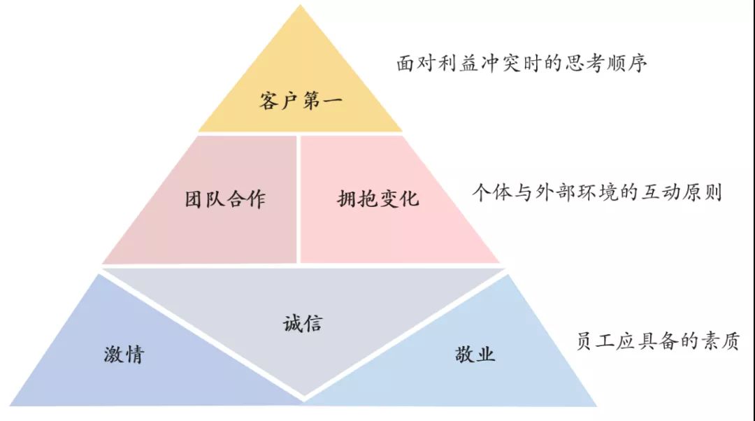 这六大价值观阐释了面对利益冲突时的思考顺序、个体与外部环境的互动原则以及员工应具备的素质。