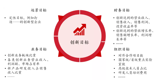通常来说,企业创新目标总体包括远景目标、财务目标、业务目标和组织目标。同时,企业在制定创新目标时也应关注创新行为系统、创新动力系统、创新支撑系统的建设目标。
