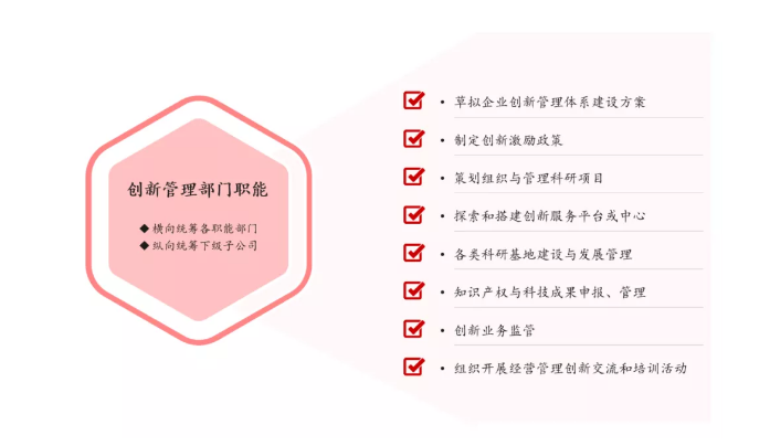 创新主体架构即进行创新行为的主体,在企业中表现为专注于创新管理相关事宜的部门,负责统筹、支持和管理企业、部门、员工的各类创新活动,调动部门、岗位之间的相互协作关系,使创新活动得到组织的最大支持。
